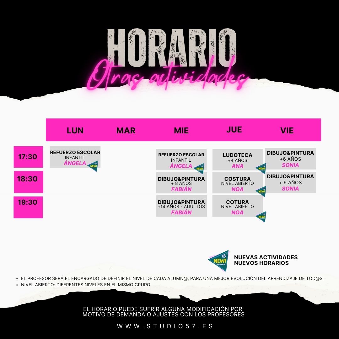 DESPIERTA TU CREATIVIDAD DESPIERTA A TU ARTISTA INTERIOR VER HORARIOS DISCIPLINAS LUDOTECAClases artísticas, Peques, Portada COSTURAClases artísticas, Portada DIBUJO Y PINTURAClases artísticas Imagina, crea, relájate, diviértete … RESERVA PLAZA TARIFA ARTÍSTICAS hora/semana | €/mes 1hora 35€/mes 2horas 50€/mes 3horas 65€/mes 4horas 80€/mes